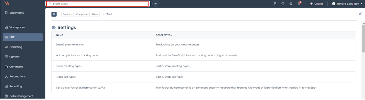 Navigate to the Search Bar and search for Event Types.