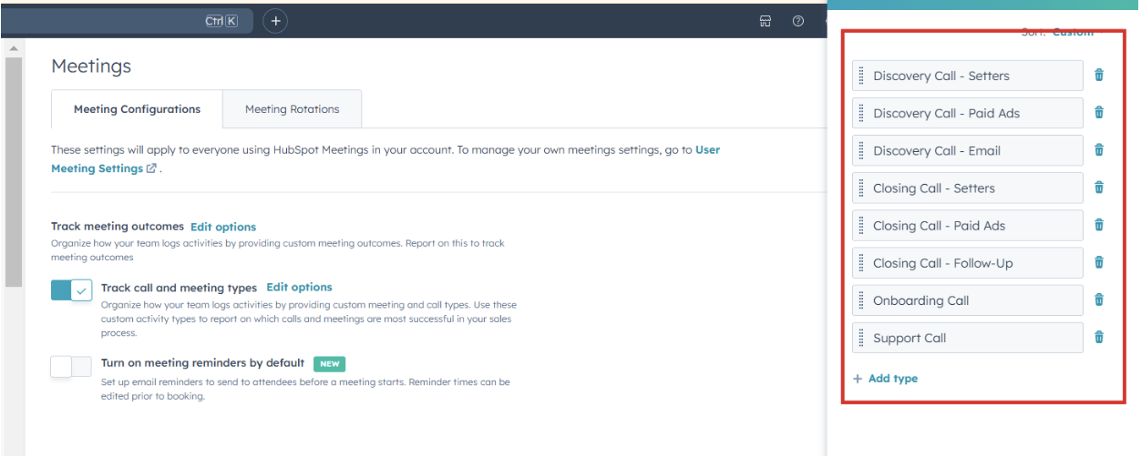 Add the meeting types you want to track (e.g., "Discovery Call," "Strategy Session") and save your changes.